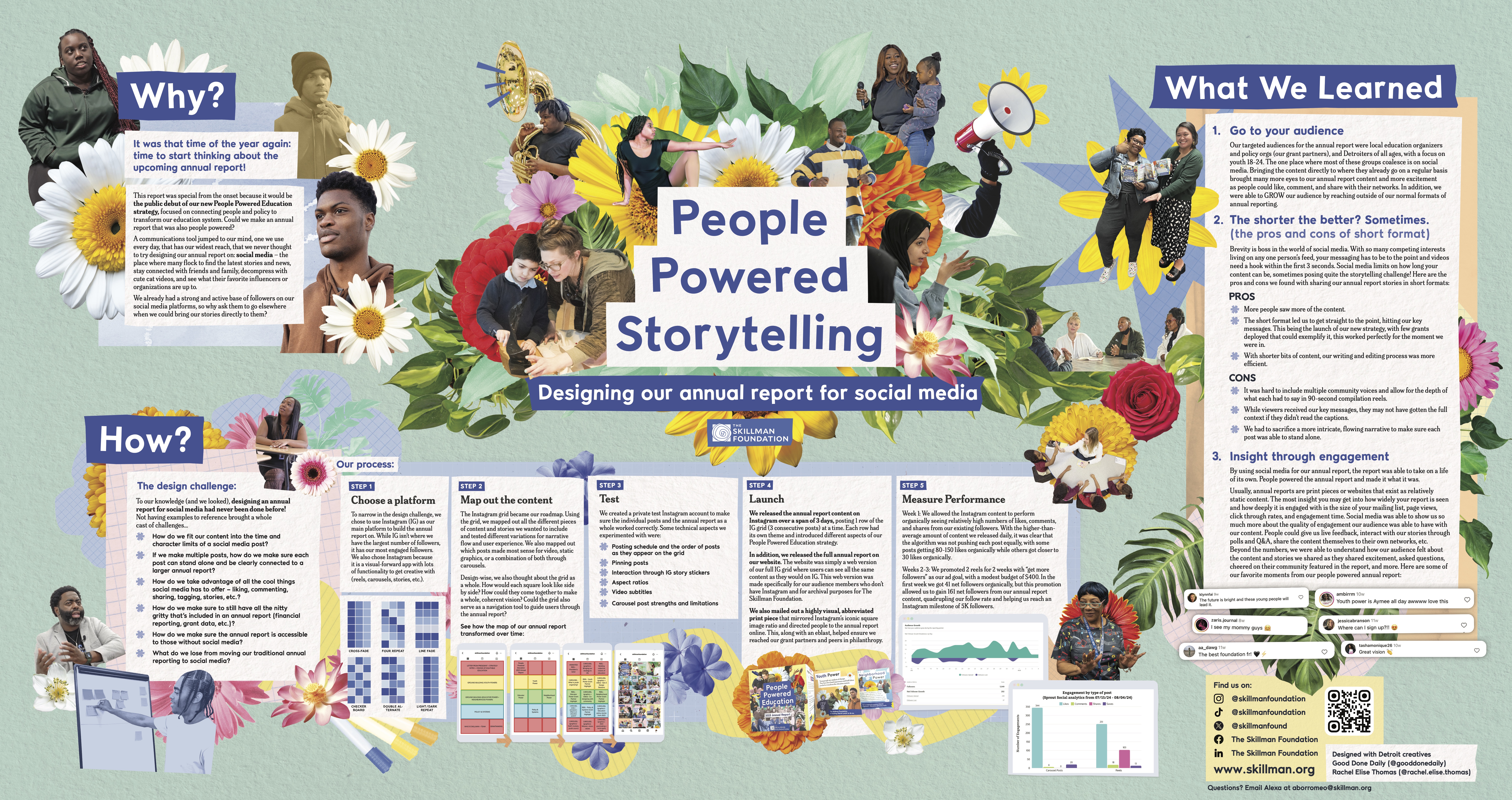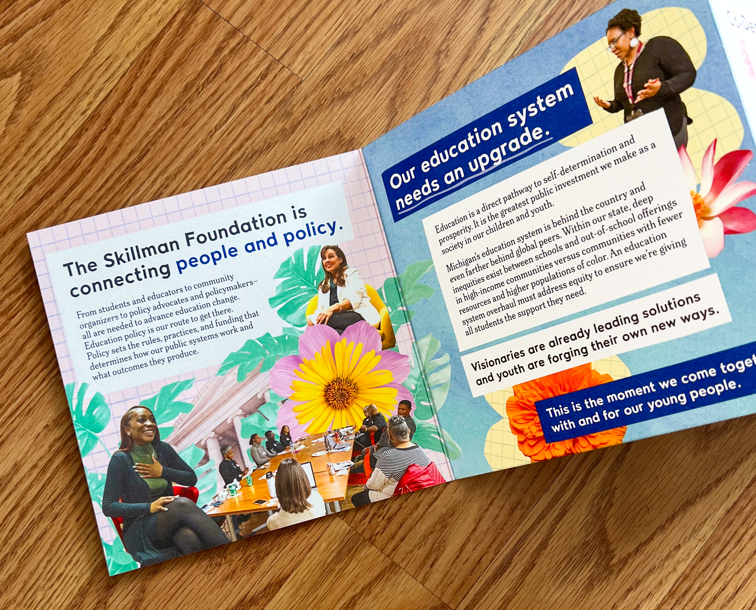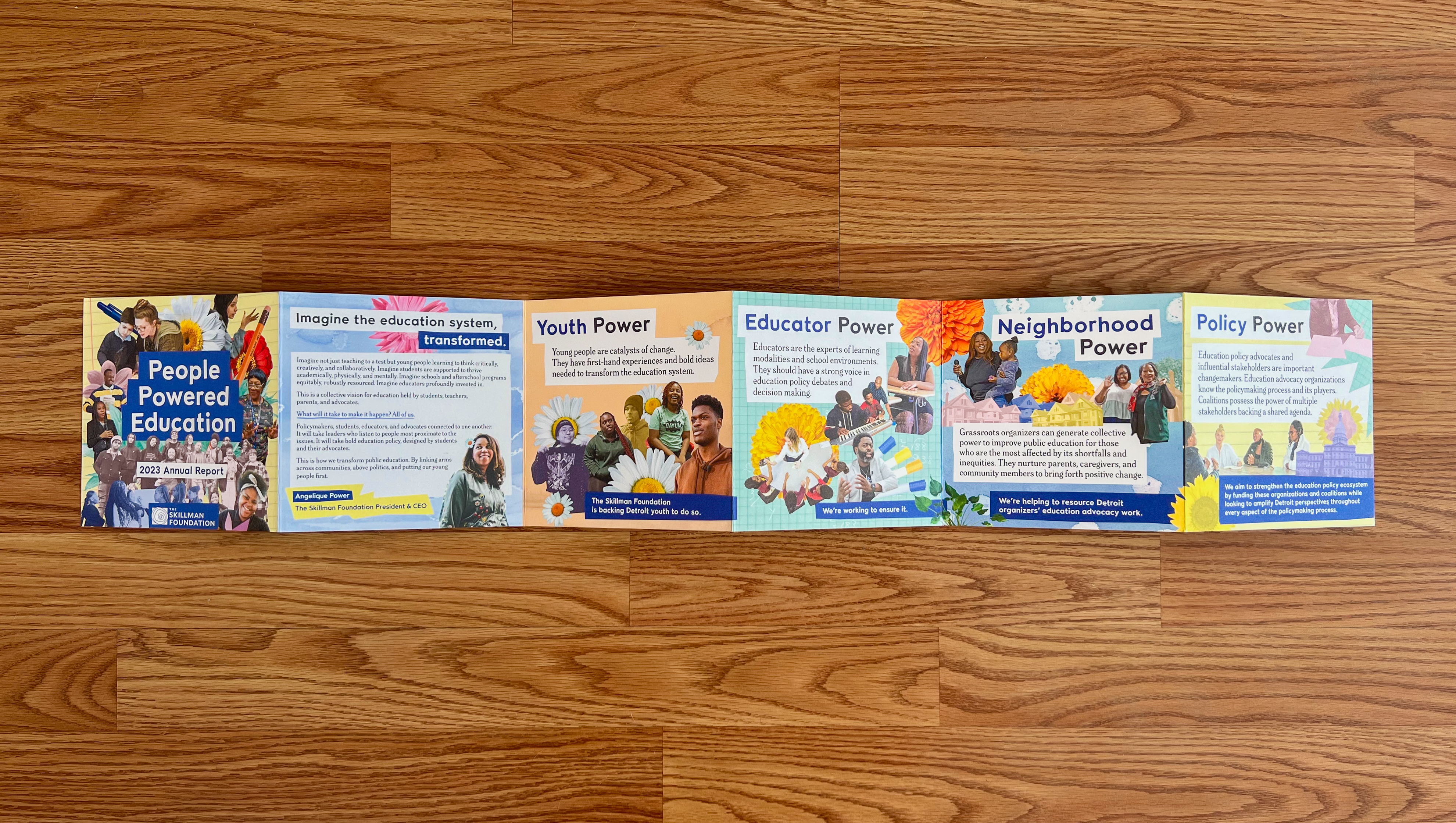 For the Skillman Foundation 2023 Annual Report, the Foundation wanted to experiment with a largely digital and social-media-focused approach, delivered through videos and graphics designed by Randall Bruder. I designed the accompanying accordion-fold print piece, created specifically for their funders, to complement the digital experience while giving a tangible touchpoint that reflected the Foundation’s mission. The piece translates the digital-first concept into a physical format, balancing storytelling, clarity, and engagement in a compact, interactive design.