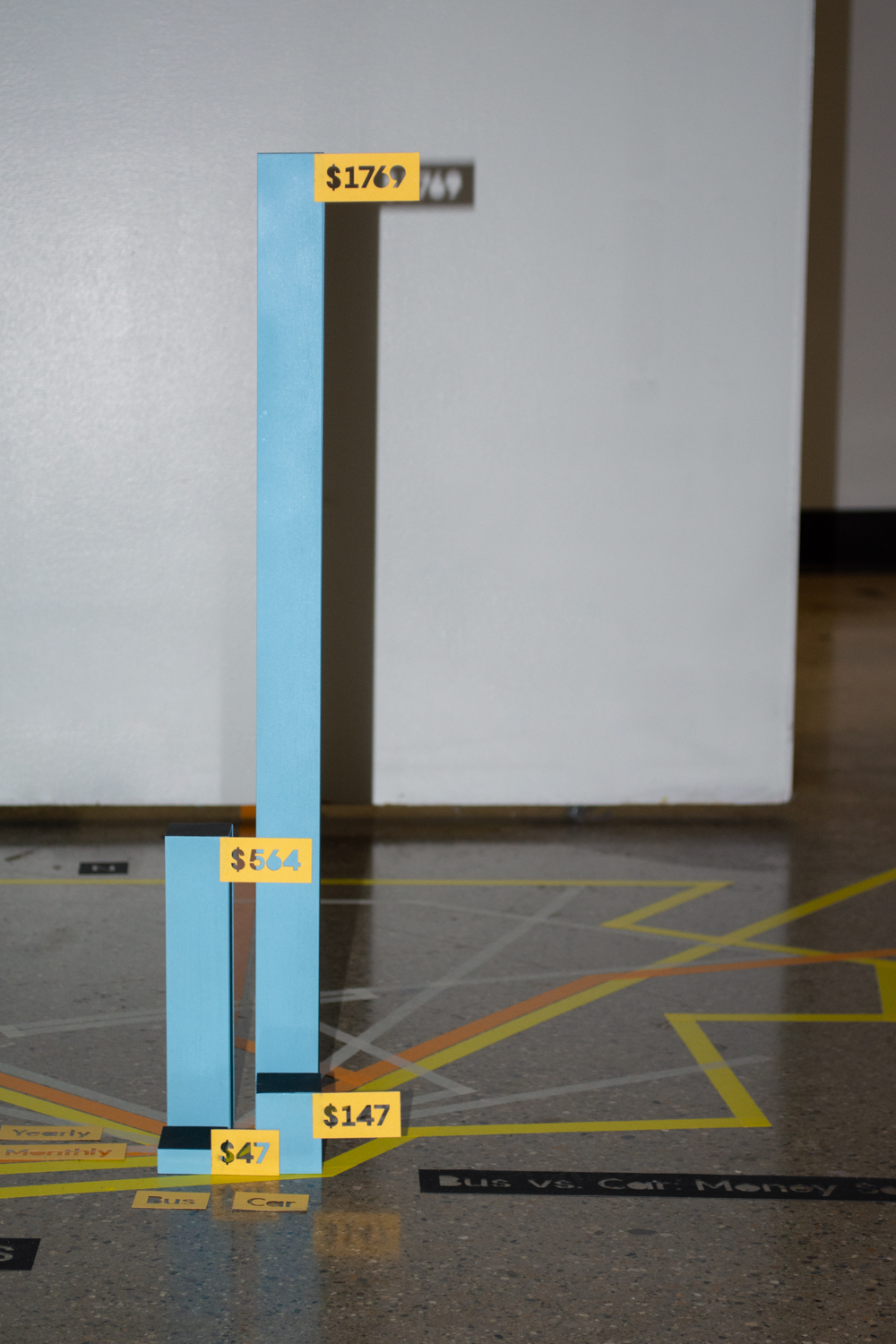 On the subject of transportation in Detroit, and taking inspiration from bus route posters, colored tape was placed all over the floor to create an eye-catching, life sized visualization resembling a city map with graph bars representing buildings downtown. Mapped by hand with a ruler and an x-acto blade as trusty sidekicks.